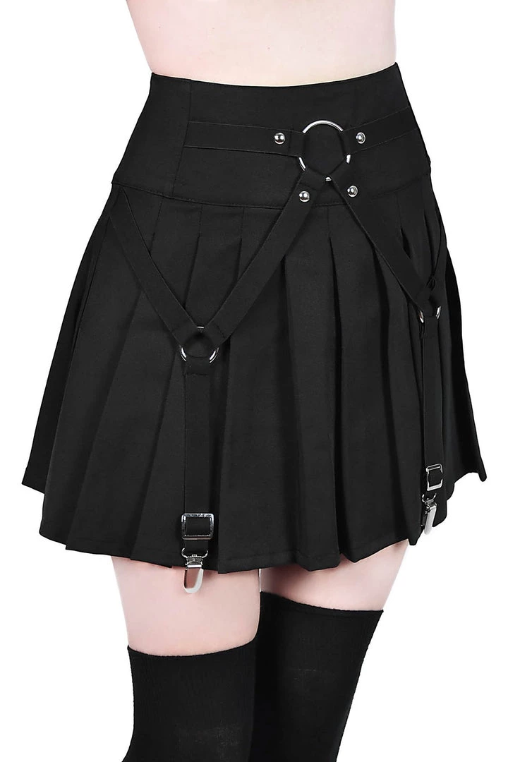 Always in control with the ‘Vicious Vibes’ pleated mini with just the right balance of detail. Featuring a soft stretch fabric for a flattering + comfortable fit; with a pleated body and statement straps to the front. Adorned with O-rings and suspender-holders and zipped back for easy on/off. Easy to dress up or down, depending on yer mood [or moon]
