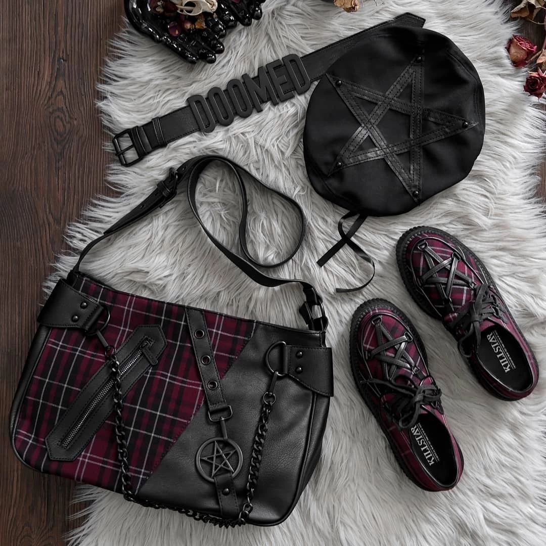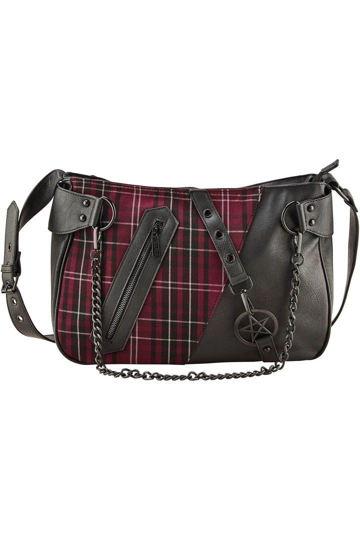 You have to trust your own madness- accessorise with our ‘Harley’ chain bag. Features a blood tartan panel, zip closure, chain and pentagram hardware.