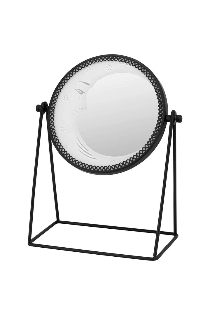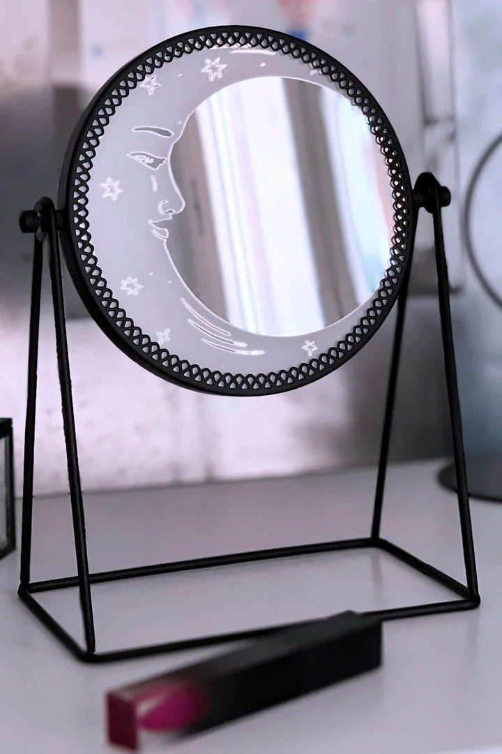 Mirror, mirror on the wall… Add your own dash of moon magic to any room; the enchanted ‘Astral Body’ round desk mirror is perfect for your finishing touches! The perfect size to keep on your desk/vanity table, rounded shape with black iron finish and stand and crescent moon decoration.