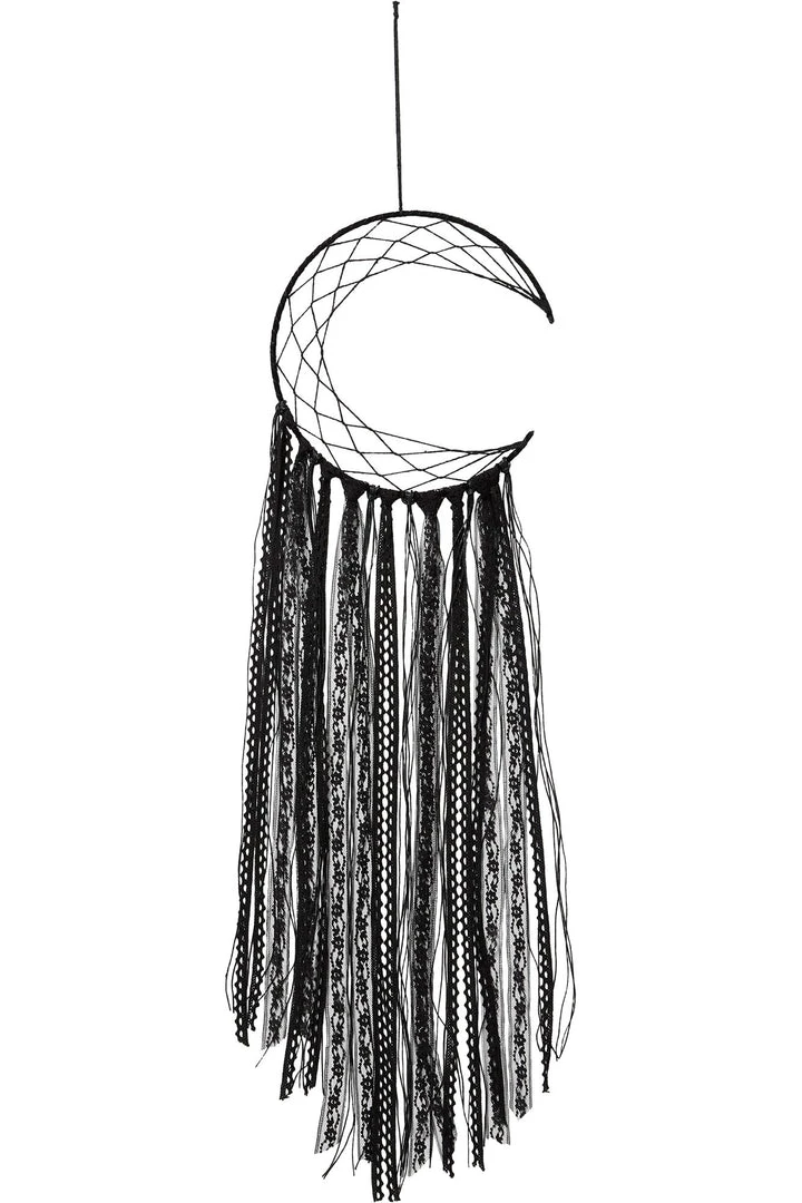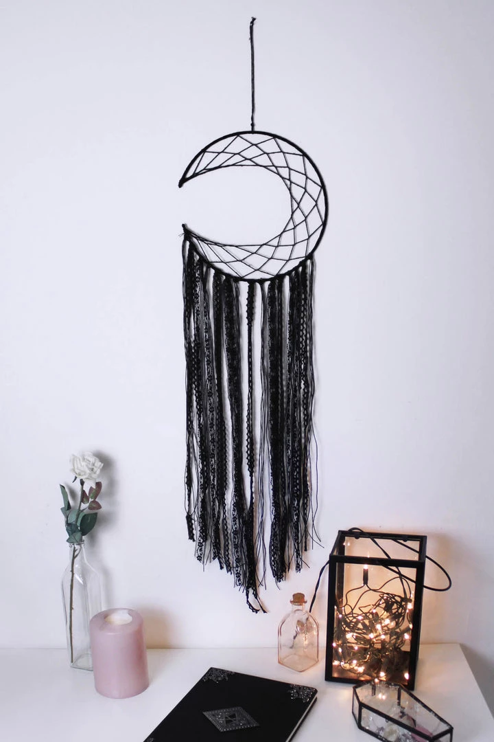 Finish your tranquil abode with this all black monochrome dream catcher; with a statement moon crescent with long cascading black ribbons. Perfect for candlelit nights with your fav books and drink.