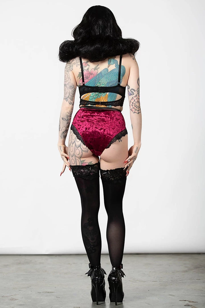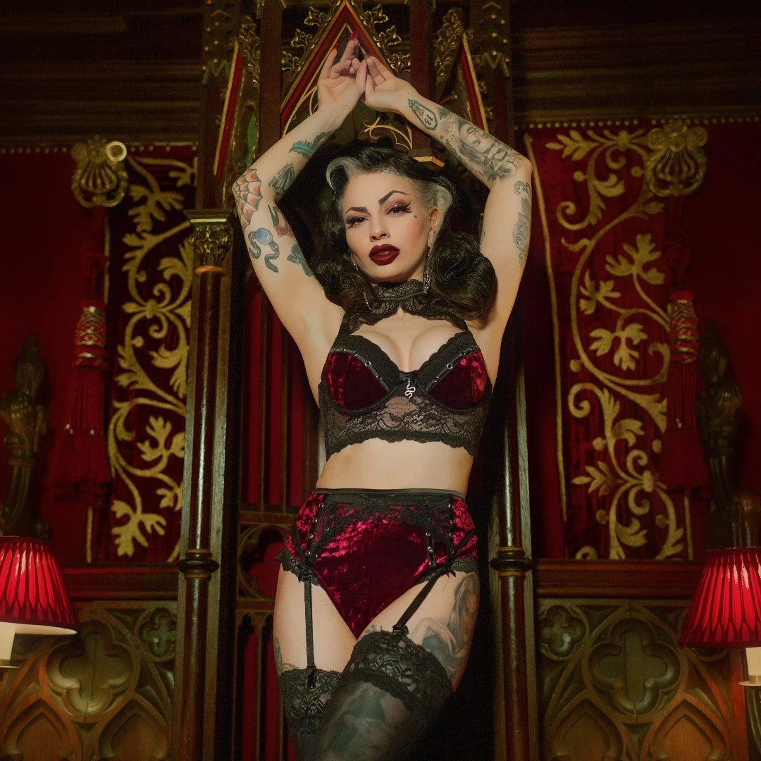 Make them beg for your attention in our ‘Mercy’ lace garter belt. Crafted in soft stretch, luxe velvet with lace trim and finished with metal rivet details and adjustable suspender straps. Perfect for play dates with the devil, dancing barefoot under the moon or a coven sleepover.