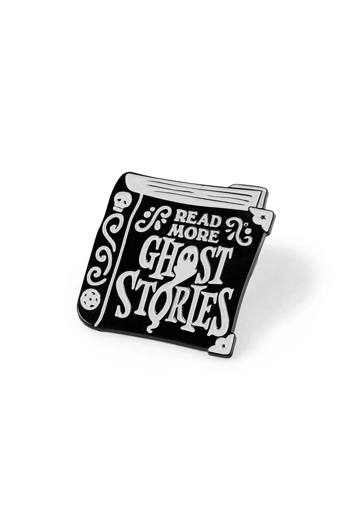 Statement ghost story lapel pin, in white and contrasting black enamel. The ideal way to add some creepy vibes to yer fav looks!