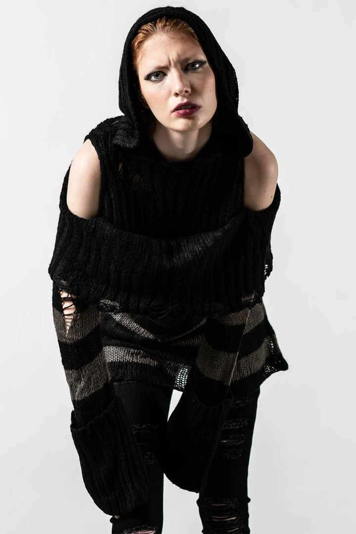 Gettin’ real cozy – the ‘Shallow Grave’ hooded knit sweater in a soft fabric; with a wide neckline, hood, long wide sleeves and with contrasting design. The long length makes it versatile AF; wear over leggings/denim or on its own as a dress!