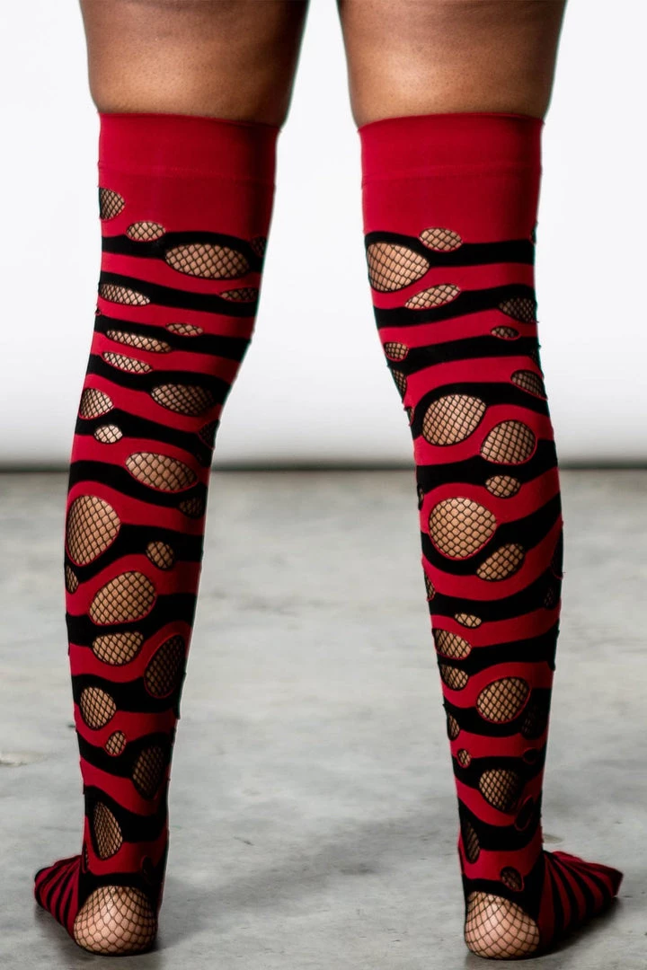 When all else fails, get new socks! Classic and exxxtra long socks – ‘Wretched Soul’ distress socks featuring contrast stripes and thigh-high look. With distressed details all over.