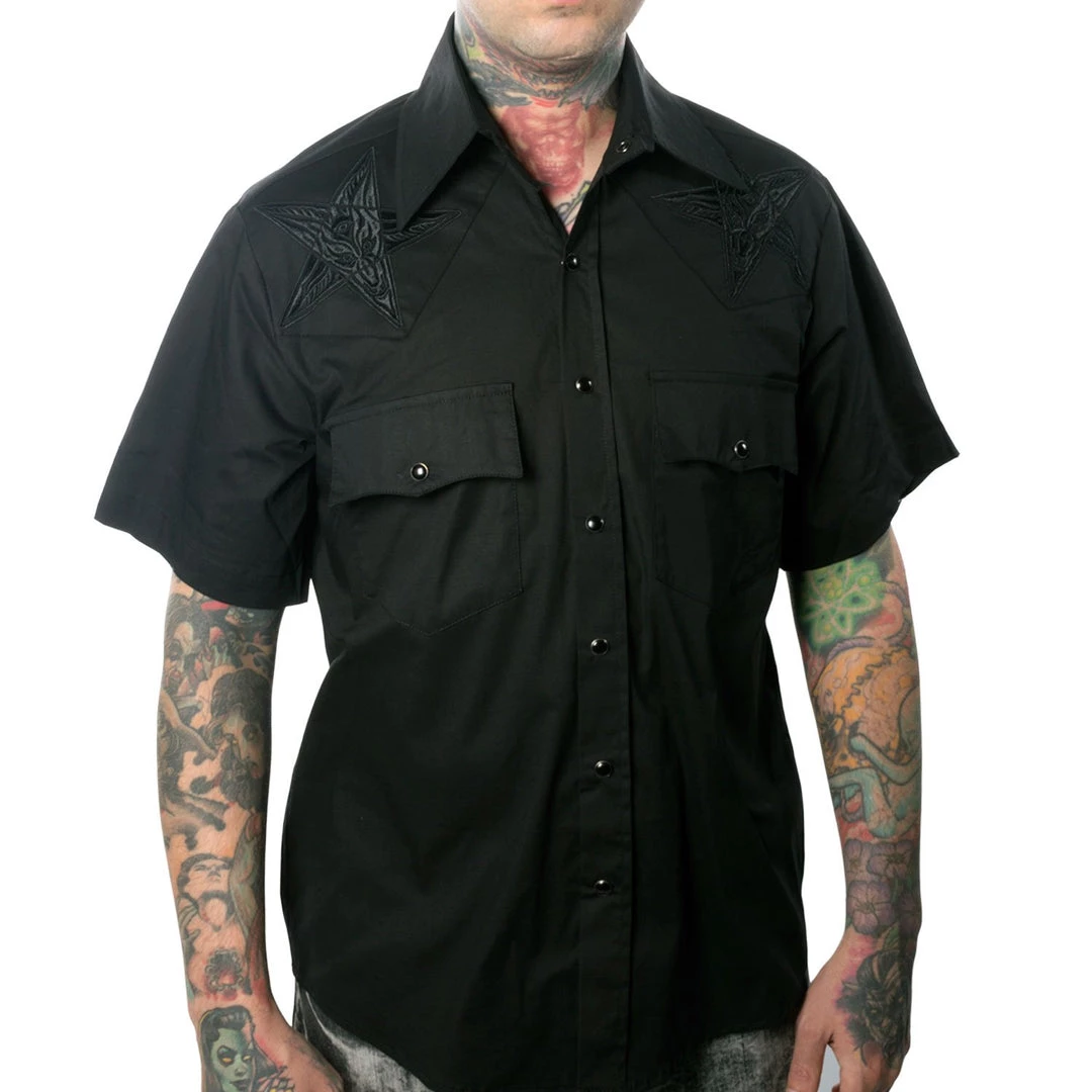Hellbilly western shirt, embroidered baphomet on print and back of shirt, cotton poly shirt with black snap buttons.