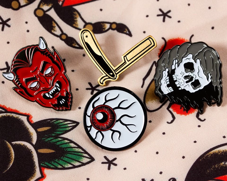Lather up and get a close shave with this straight razor enamel pin from Kustom Kreeps! Perfect for barbers and all aficionados of grooming.
