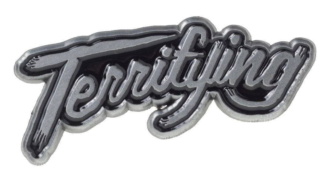 Are you….terrifying?! Elicit thrills and chills with this hand lettered “Terrifying” design from Kustom Kreeps! Just pin to your favorite vest, jacket or bag and go!