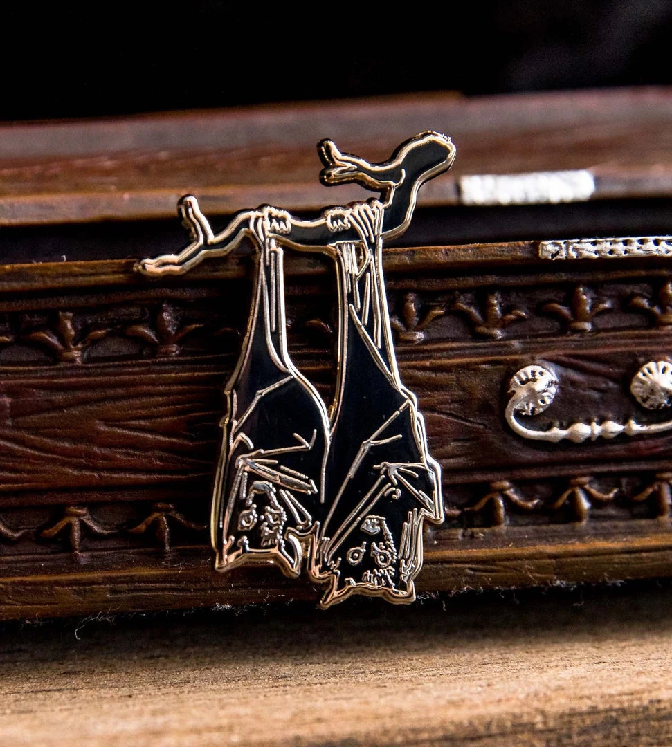 “Blood Sucking Love, Taking Flight” – Our New Nocturnal Lovers Enamel Pin embodies a duo of one of our favorite night dwelling creatures. Hanging together approx 1.75″ in length, these black bats feature hard silver enamel accents and a double backing.