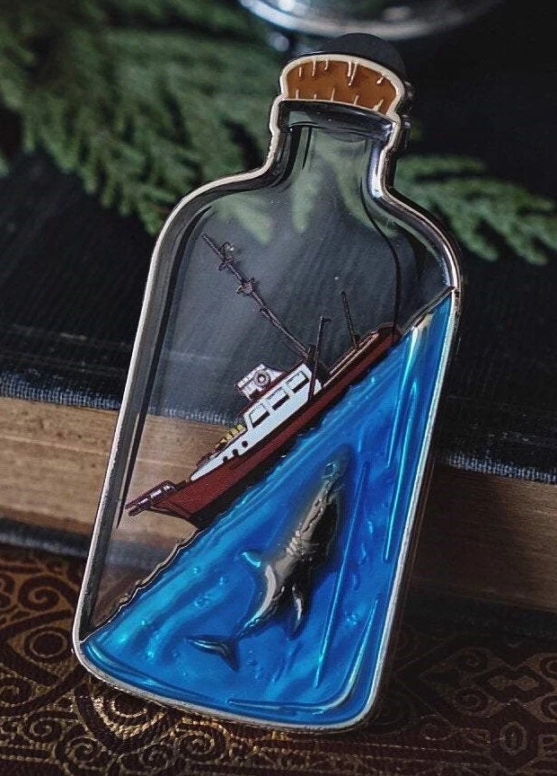 This pin features semi-transparent enamel (blue) with a shark submerging from the oceanic enamel, as well as clear enamel to emulate the glass texture of the ship in a bottle.