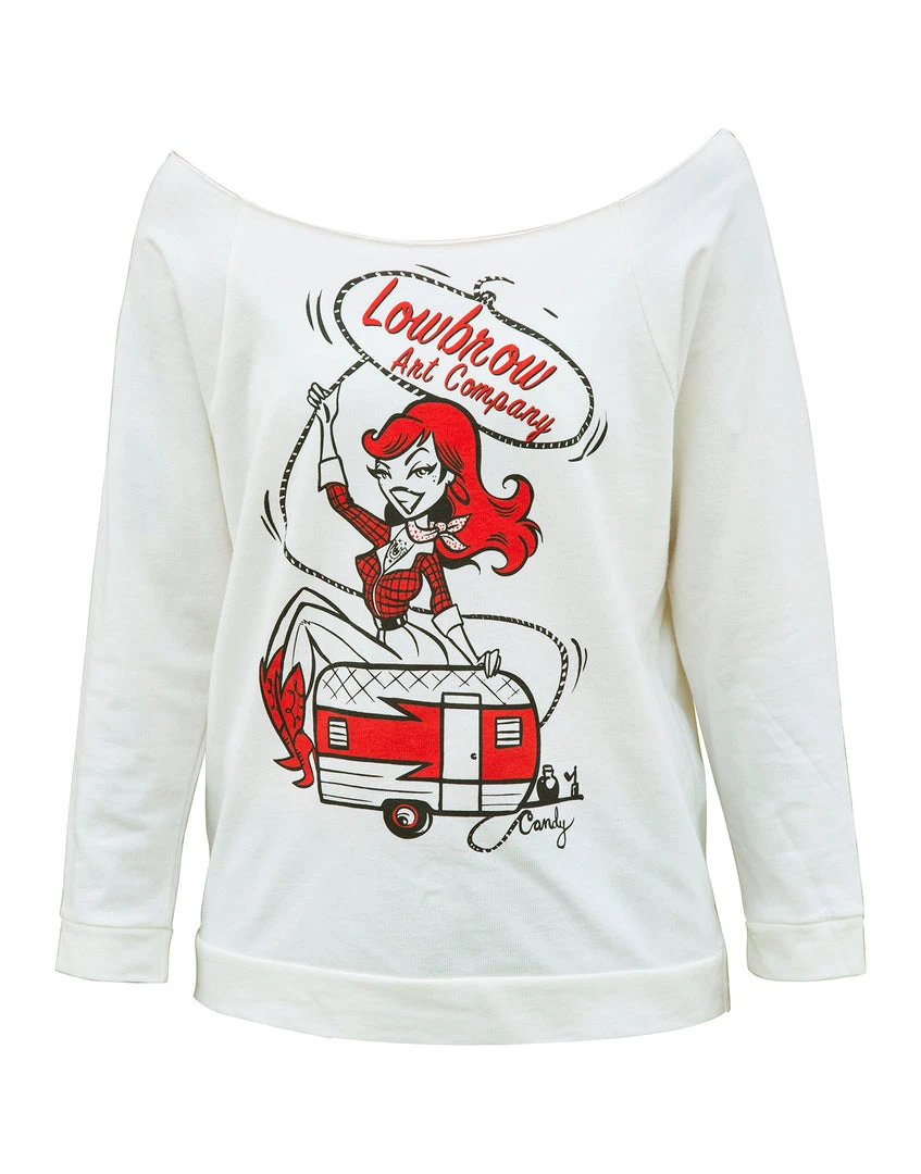 Cow Girl Up! Hop in your vintage trailer and hit the road in this adorable raw edge sweatshirt. Featuring a sassy cowgirl in red, on ivory cotton.