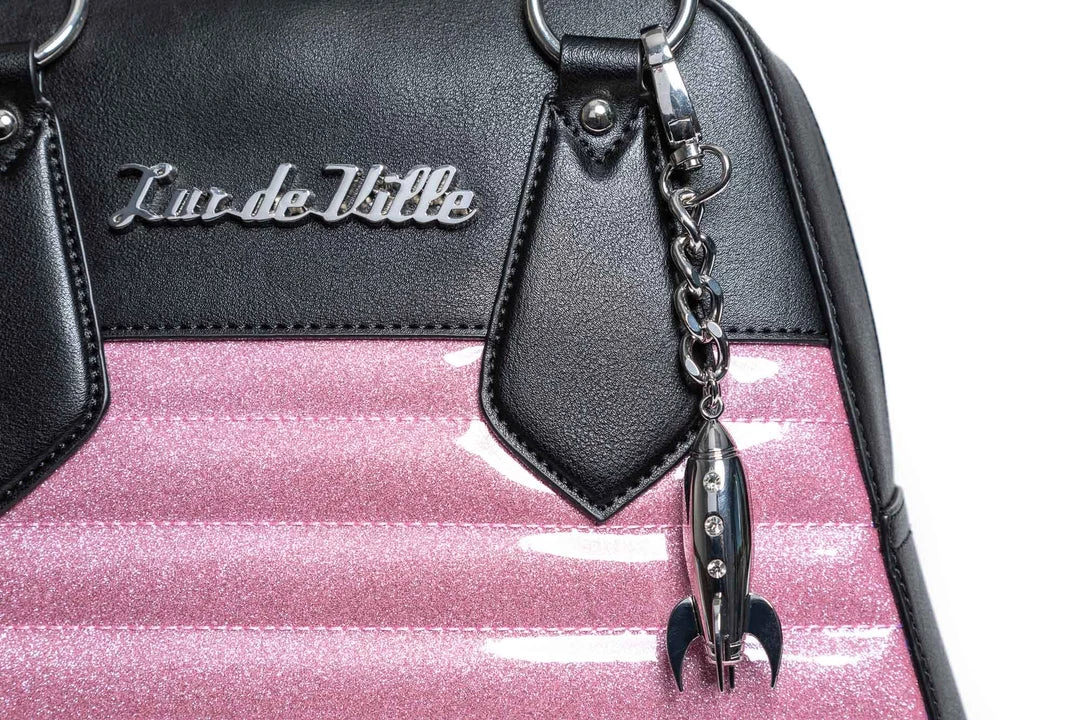 The fabulous Blast Off Totes feature tuck and roll stitching and an oversized rhinestone rocket ship bauble. Inside is black-on-black diamond lining with an inside zipper closure pocket for easy stashing.
