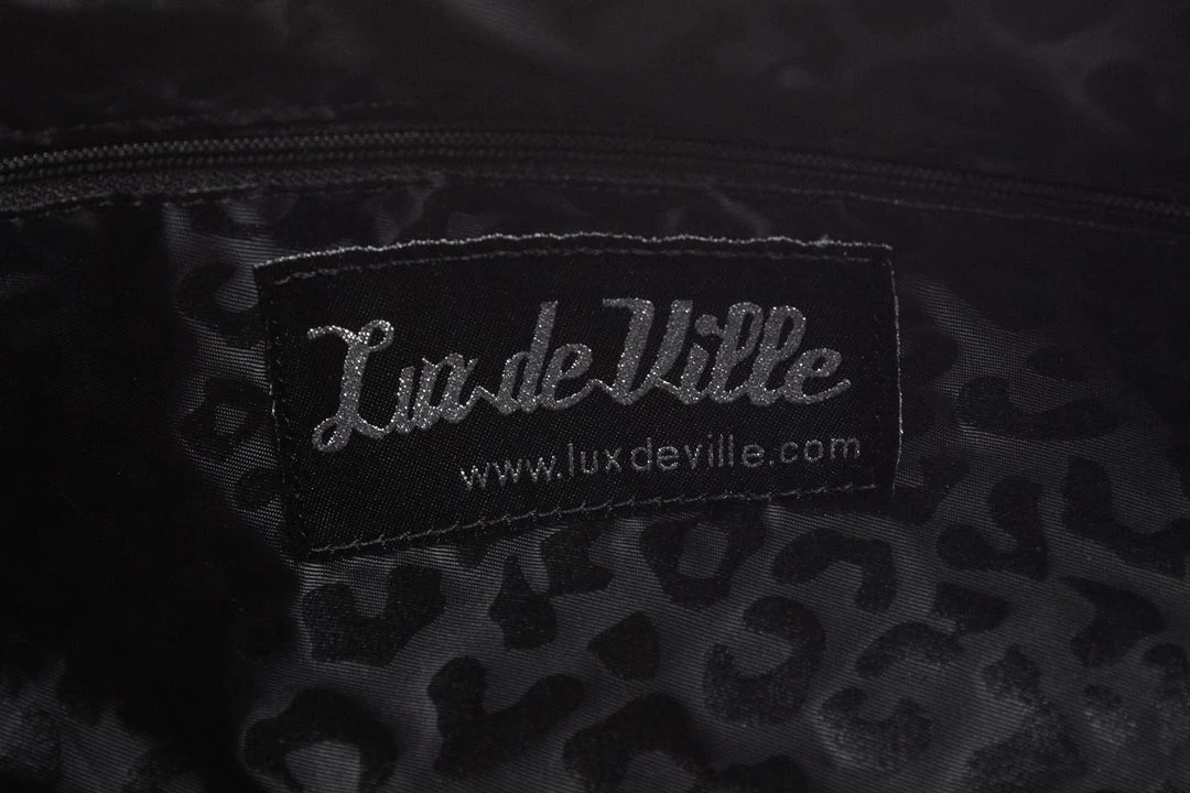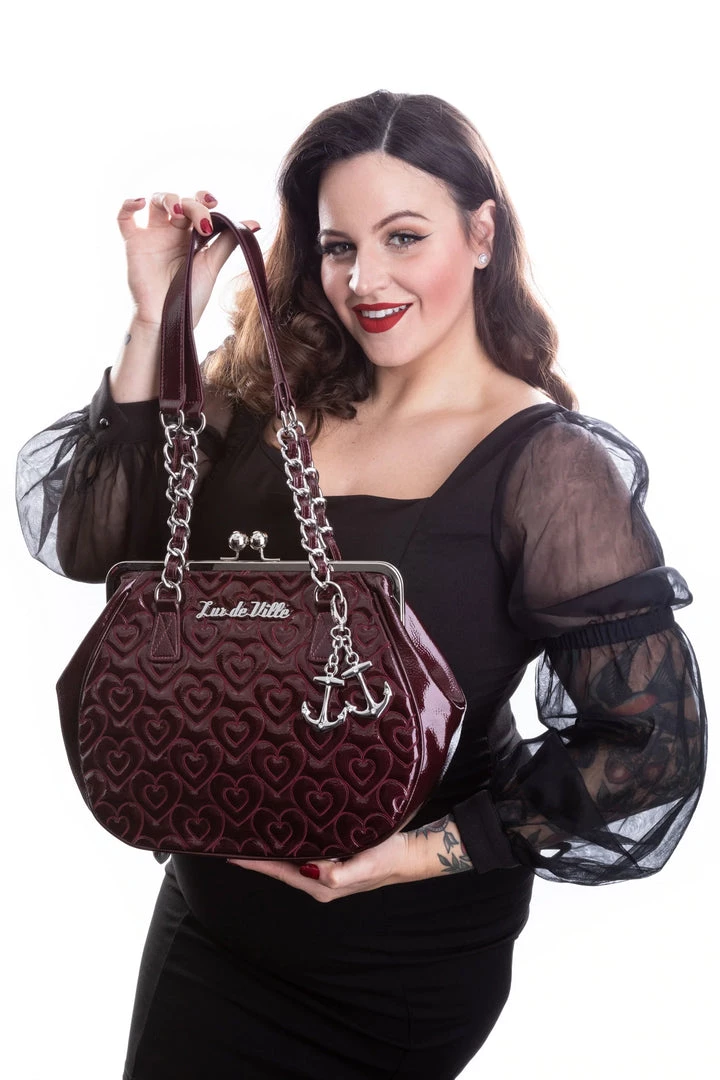 These beautiful mini kiss locks will make any sailor girl’s heart swoon. Featuring all-over heart stitching and detachable rhinestone anchor baubles, Lux Logo plate, small round silver feet, and chain detail on strap. Inside is lined with black-on-black leopard lining and an inside zipper closure pocket. These precious minis are the perfect size for day or night. Enjoy!