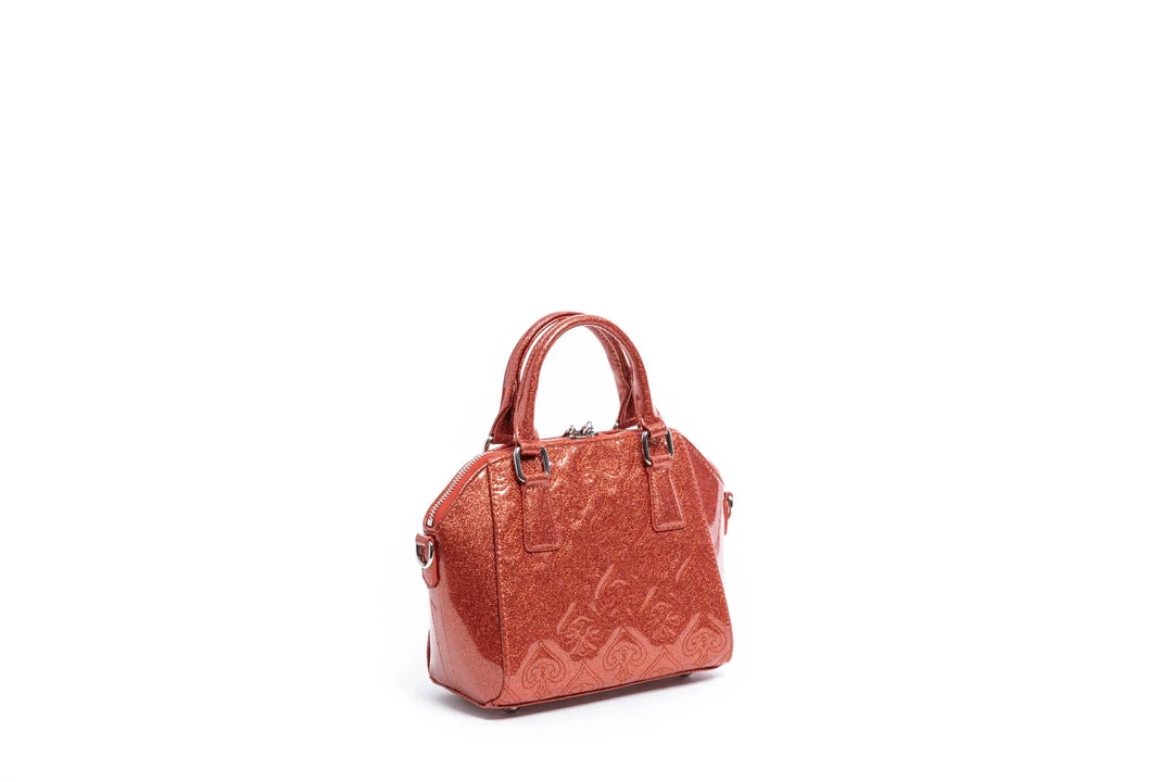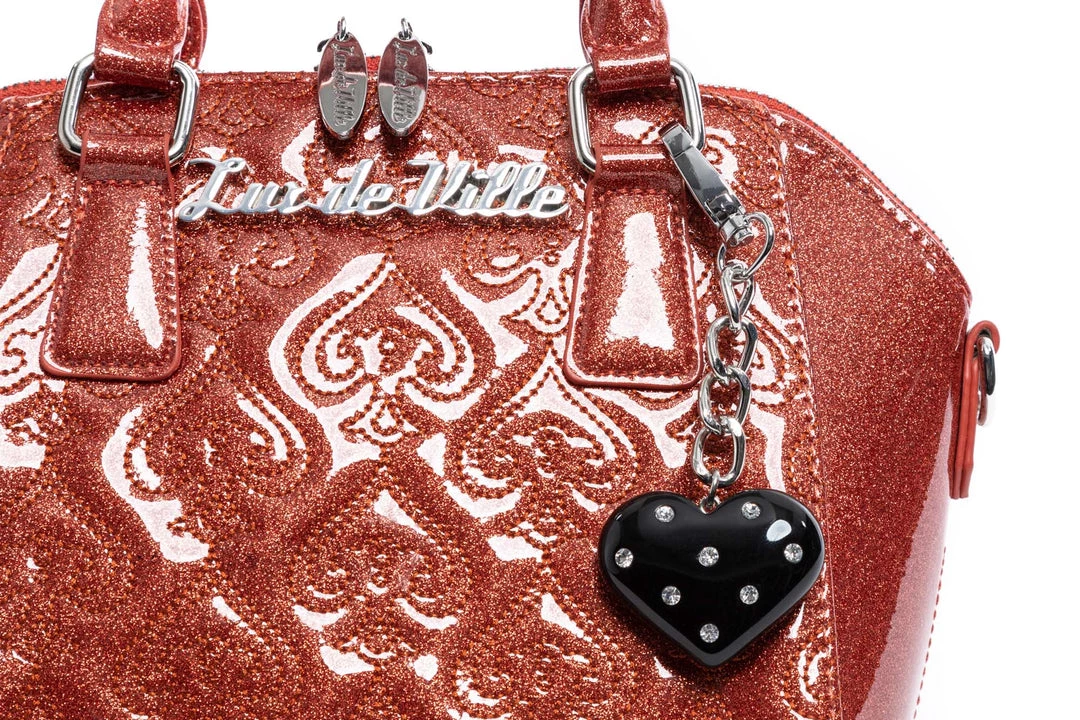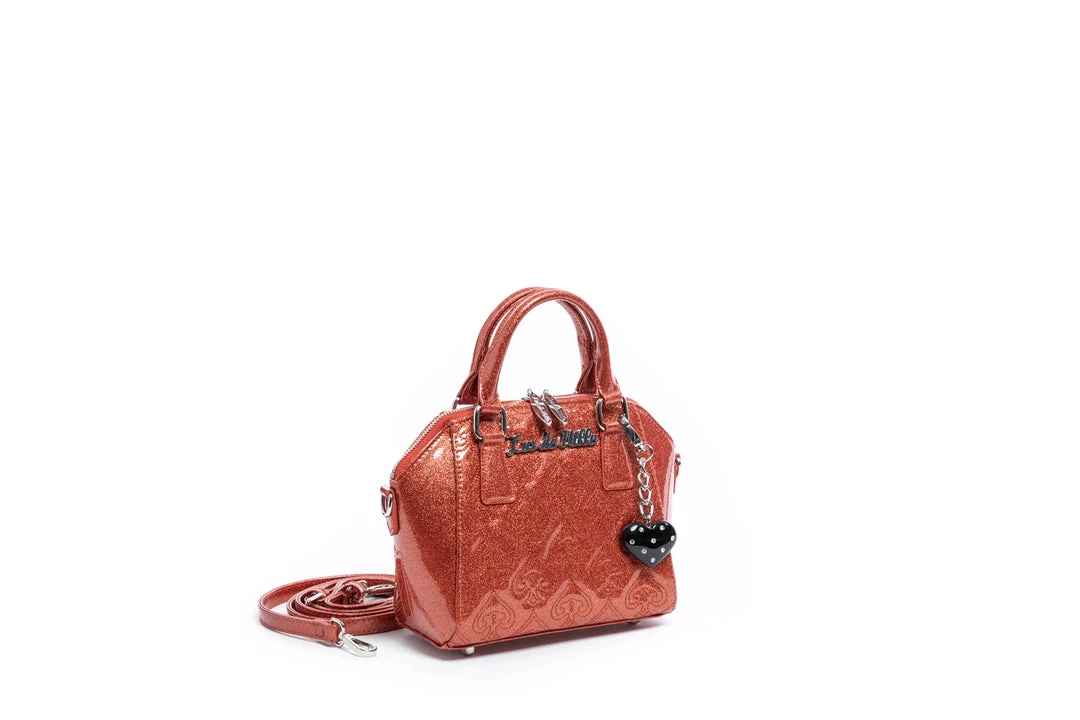 These adorable mini totes feature fancy all-over spade stitching and a rhinestone-covered Lucite heart bauble. Inside is lined with custom black on black diamond lining, silver round feet on the bottom, and an inside zipper closer pocket for easy stashing. Perfect size for day or night for anyone who just loves an adorable purse!