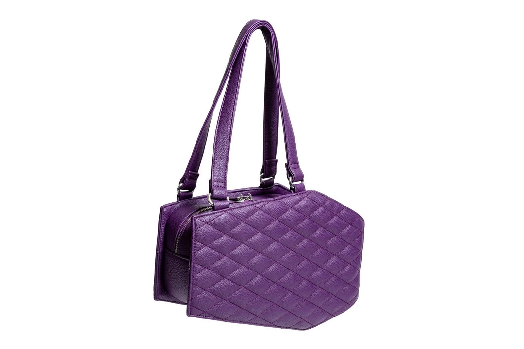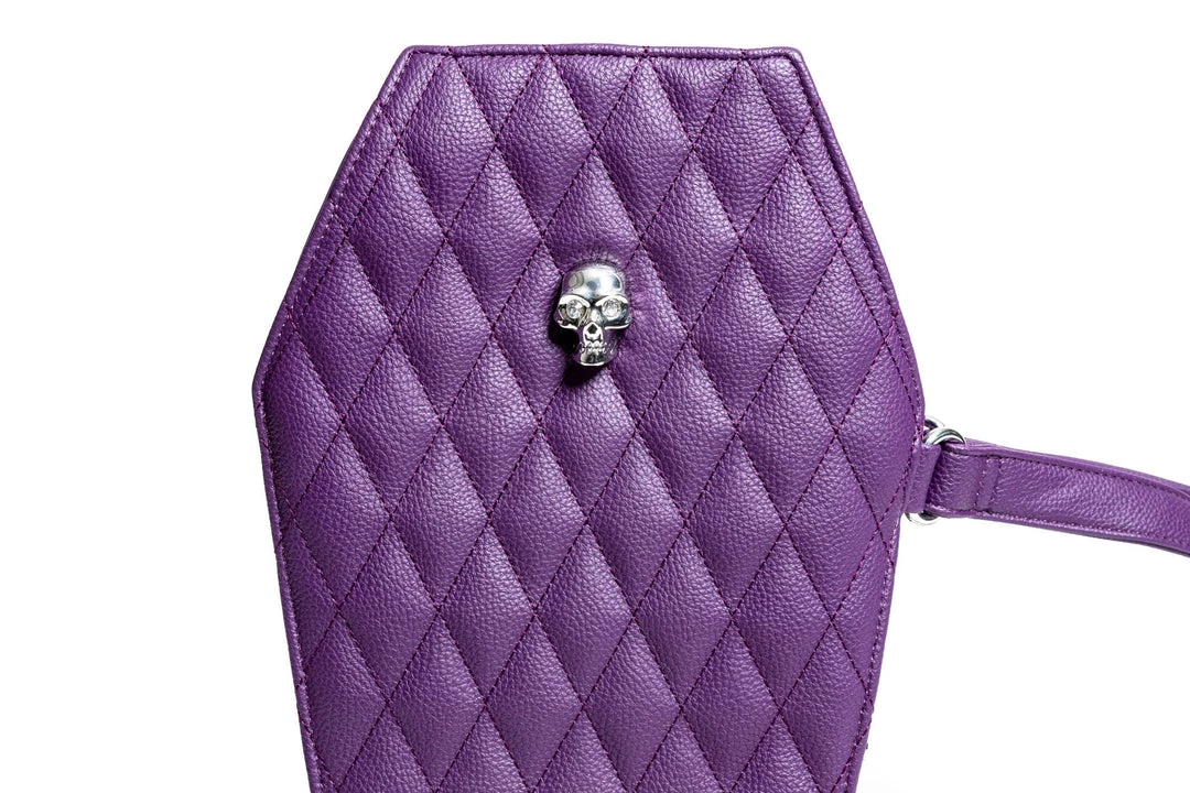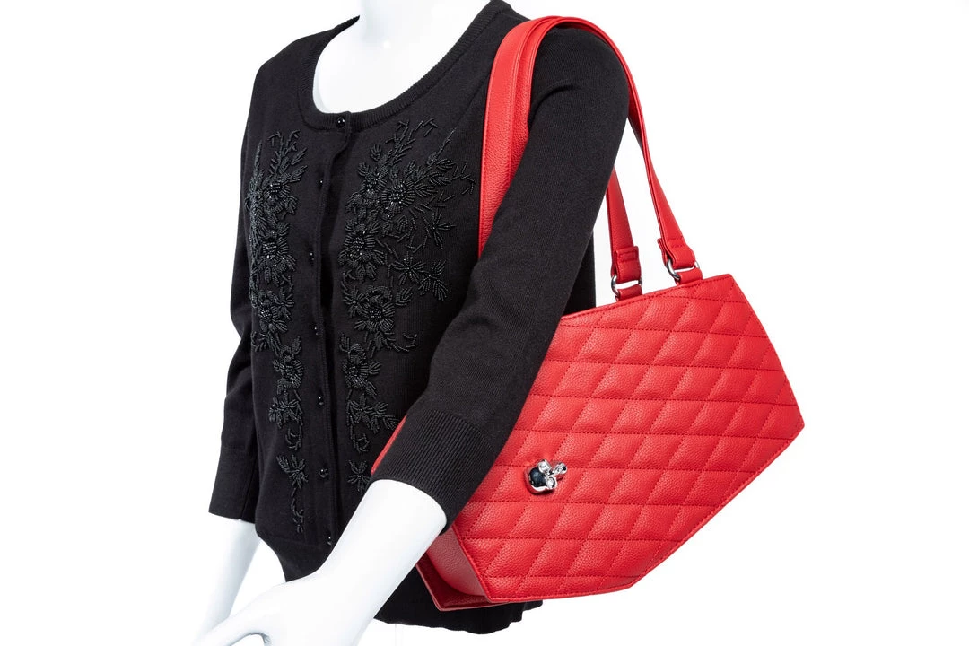 Roomy enough for a visit to the cemetery or a late dinner with your love. Featuring diamond-stitched front and back panel with mounted skull with rhinestone eyes. Inside is lined with custom black on black diamond lining and they have an inside zipper closure pocket for easy stashing.