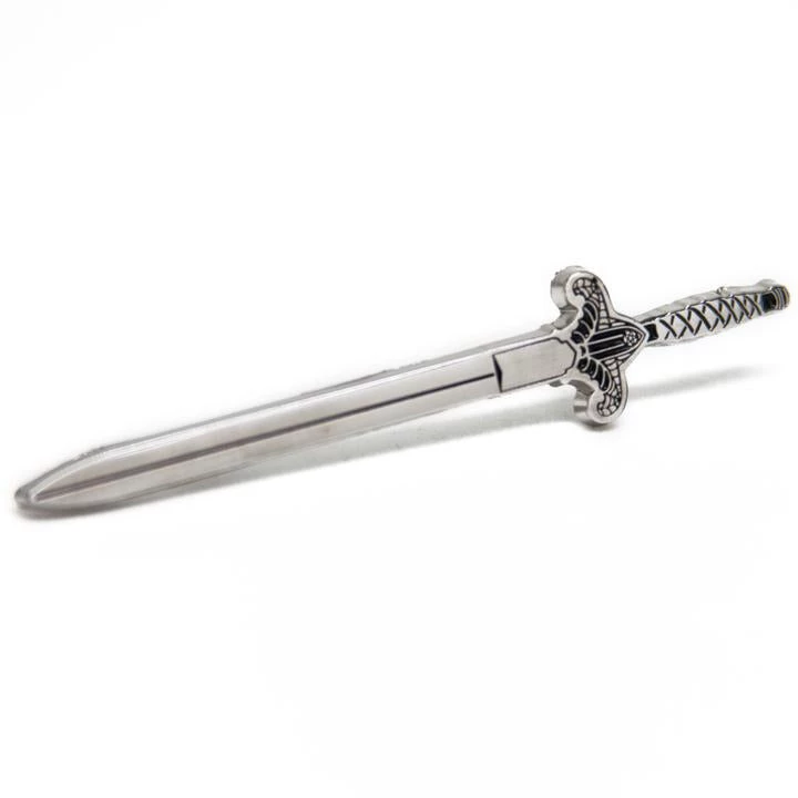 Each pin measures 3 in long & 0.5 in. wide at the sword hilt, and is made with intricate silver details and black enamel. This design features 2 clasps on the back for extra security and comes with rubber backings.