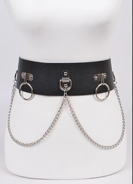Head to the Bondage Ball with this badass belt! Highwaisted, looks killer with dresses or body suits – featuring bondage rings, chains, and snap closure backing