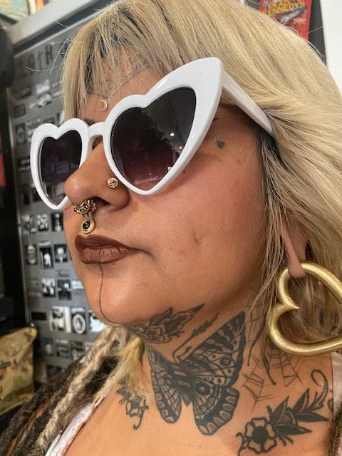 These sunnies are sure to capture your heart! These thick white frames feature shiny, tinted lenses. Sure to make your heart melt!