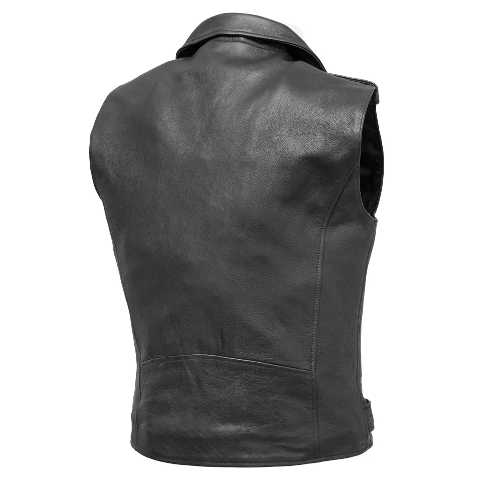 Rockin’ – Men’s Motorcycle Leather Vest- Featuring a classic motorcycle style w/ snap down label, collar, epaulets and asymmetrical zipper. This is a tried & true classic, with a price point that won’t break the bank.