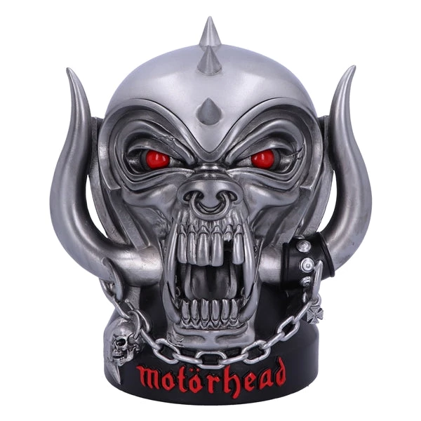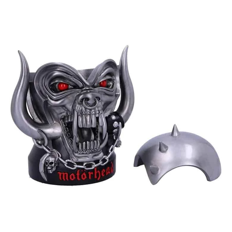 Representing potency, filth, loudness and freedom, the iconic, snarling, salivating Warpig (also known as “snaggletooth”) has become a vital ingredient of the band’s legacy, perfectly representing the Motörhead attitude and lifestyle. Its deep-red eyes stare ahead unblinkingly while the top of the tri-spiked helmet can be removed, revealing a spacious storage space. Cast in the finest resin before being carefully hand-painted, this intimidating icon of rock is the perfect way to keep precious keepsakes safe.