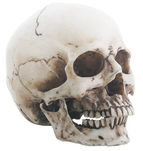This miniature human skull is made of cast resin and has been hand painted for a naturalistic, weathered bone finish. Removable Jaw in case he gets mouthy