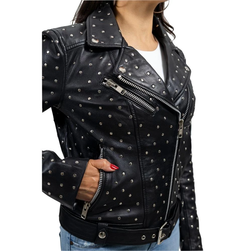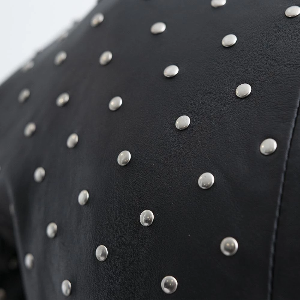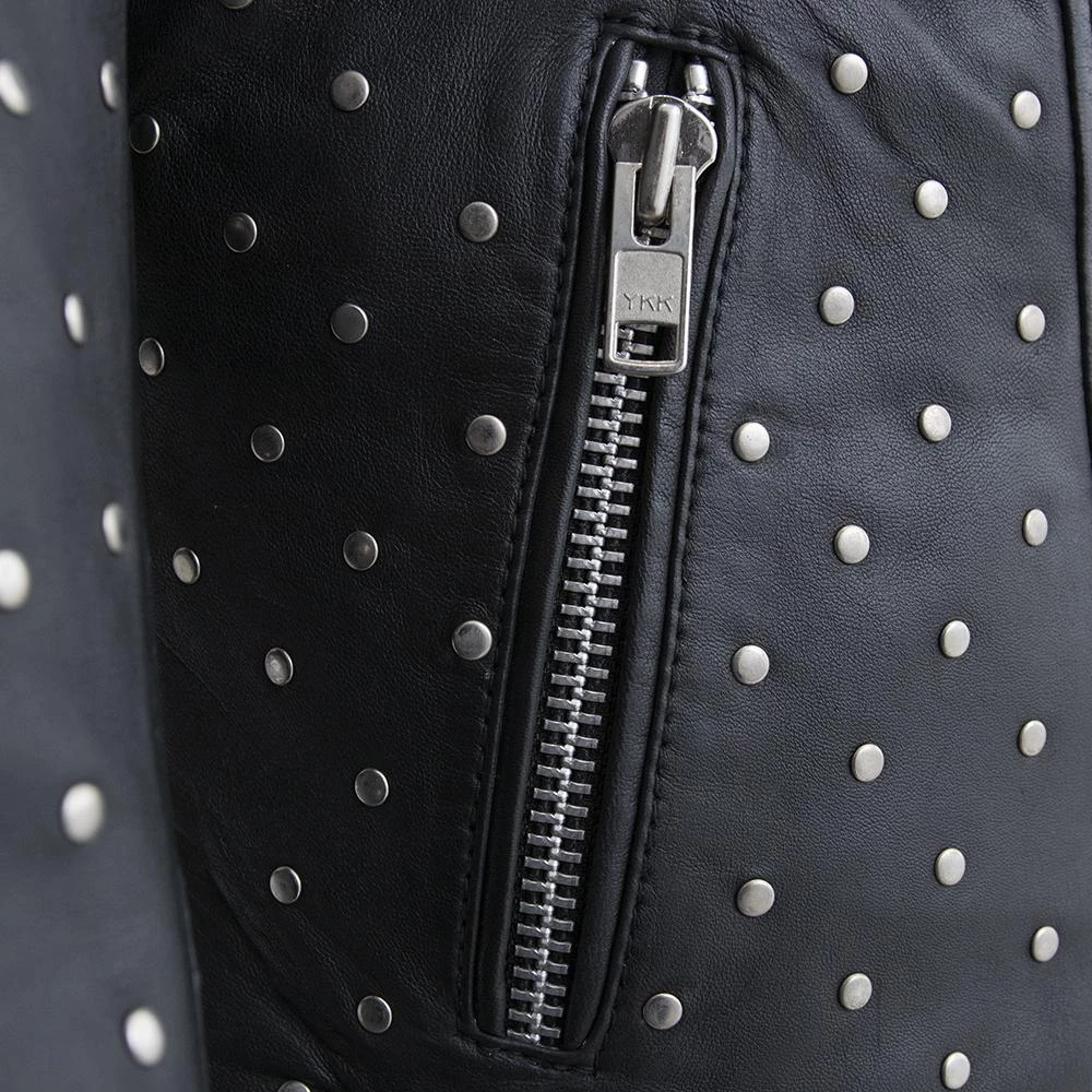 Looking for a head turning piece that will always make you stand out in a room? This studded up jacket is for you! Featuring a classic motorcycle style neck line, SUPER soft lambskin leather, zipper front, and pockets in all the right places!