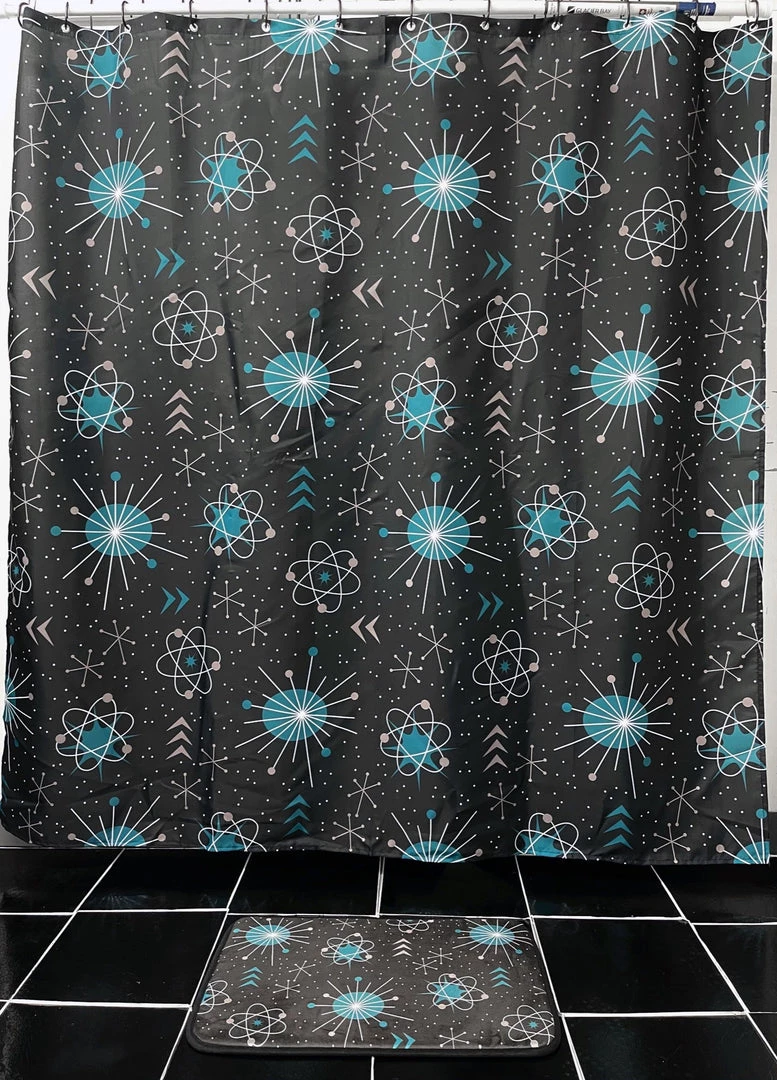 Blast off into outer space with our perfectly retro Atomic Shower Curtain! This vintage-patterned shower curtain captures the best of 1950s’ atomic designs in teal, white and gray on a black background. Made of 100% polyester, it’s washable, and even comes with matching black rings so it’s ready to hang!