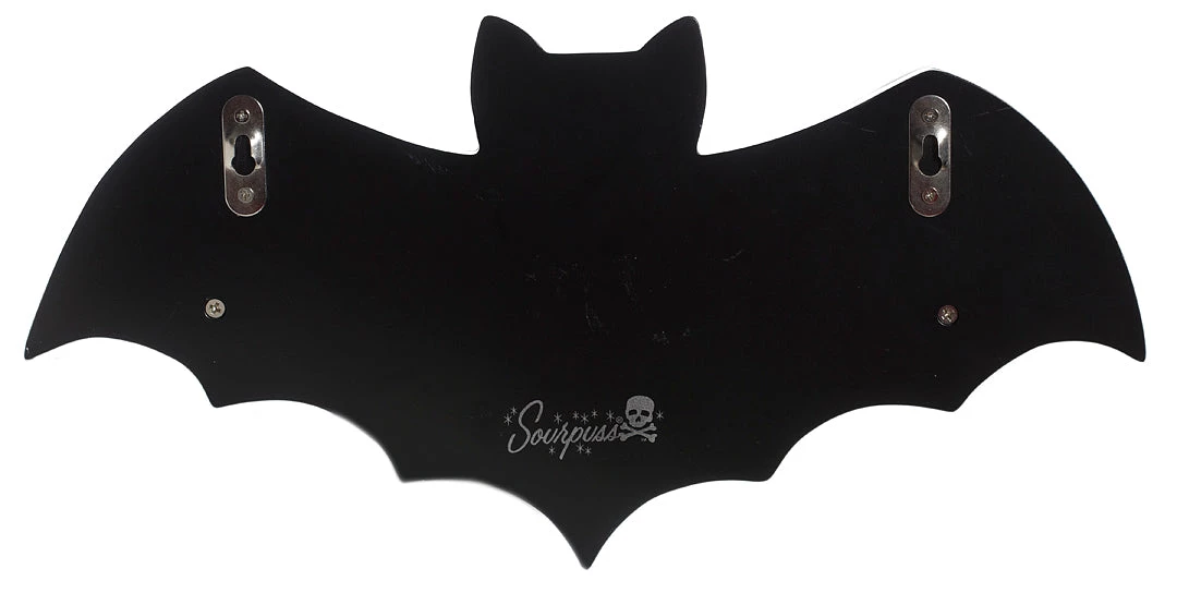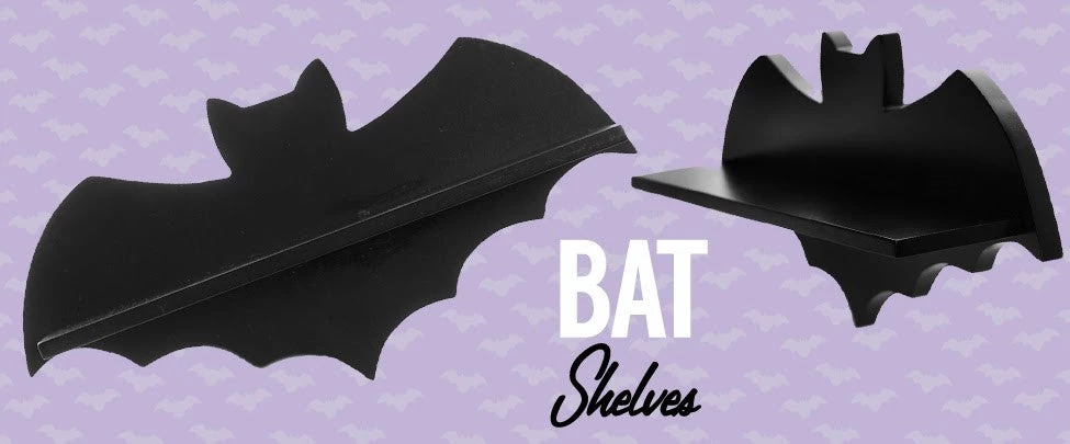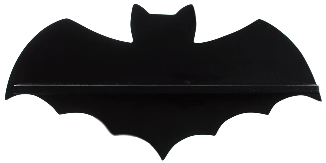 If you tend to fly by night, the Bat Shelf wants to spread its wings in your abode! Both decorative and totally functional, this sturdy black shelf features the silhouette of a certain famed creature of the night and will add an extra element of spookiness to your wall. It looks perfect on its own and even better holding a few of your favorite books, teeny taxidermy or any other macabre treat. Includes two recessed hangers on the back for sturdy mounting.
