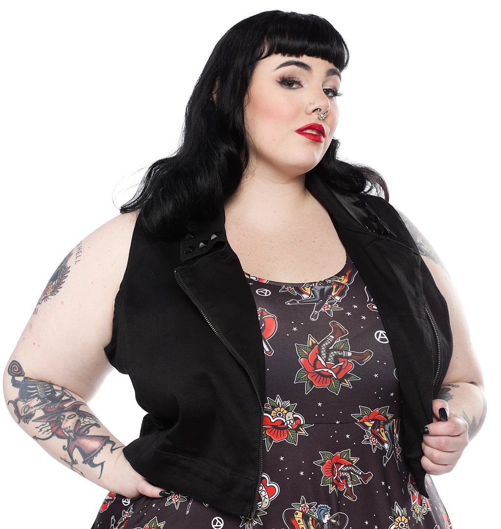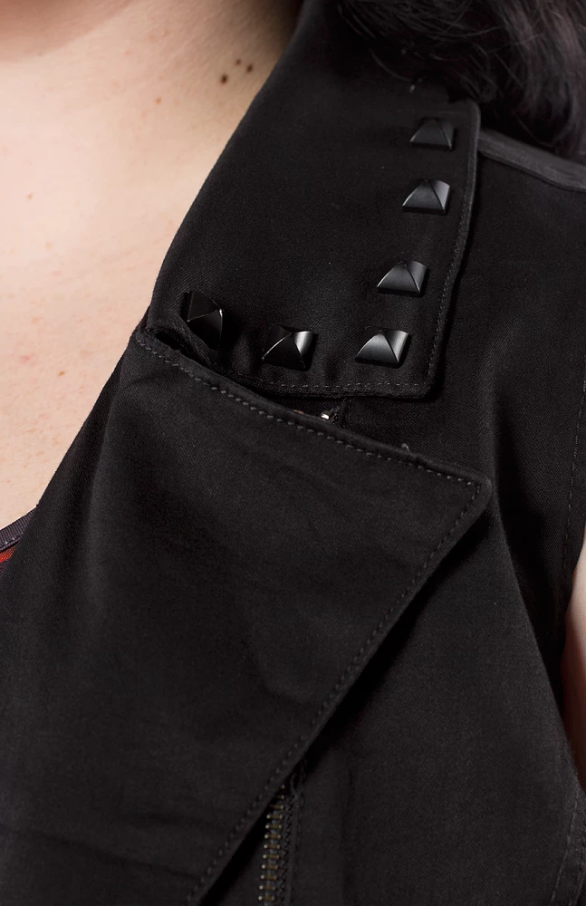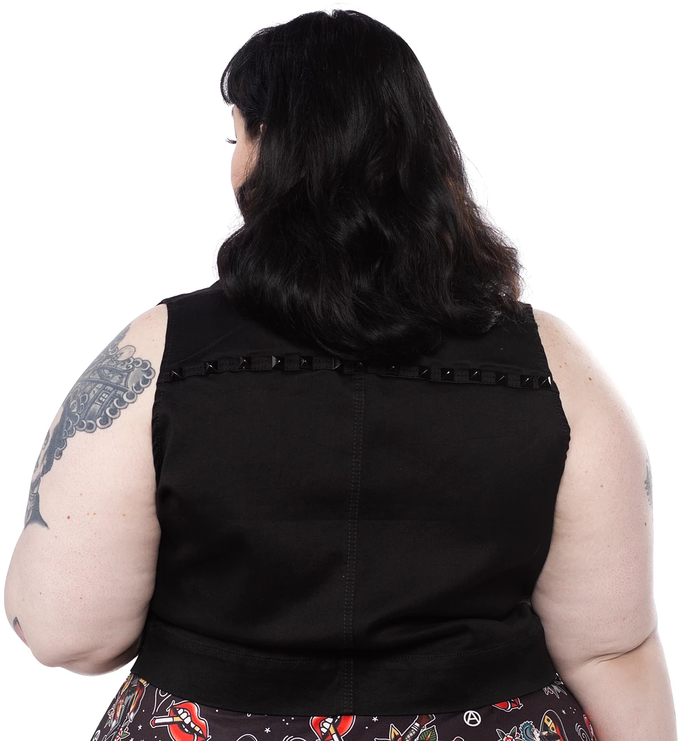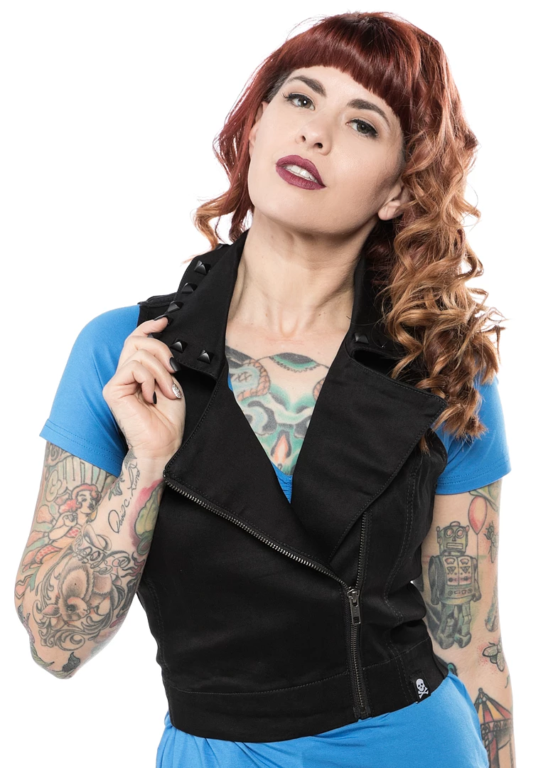 Let us introduce you to your new favorite vest! The Moto Vest from Sourpuss has the same shape and design as the Moto Jackets, but they have a hidden inside pocket to stash your credit cards, cash, lipstick and snacks! (that list was not in order of importance, obviously.) The fabric is a little bit stretchy, and the studs around the collar and back yoke give it just the right amount of edge!