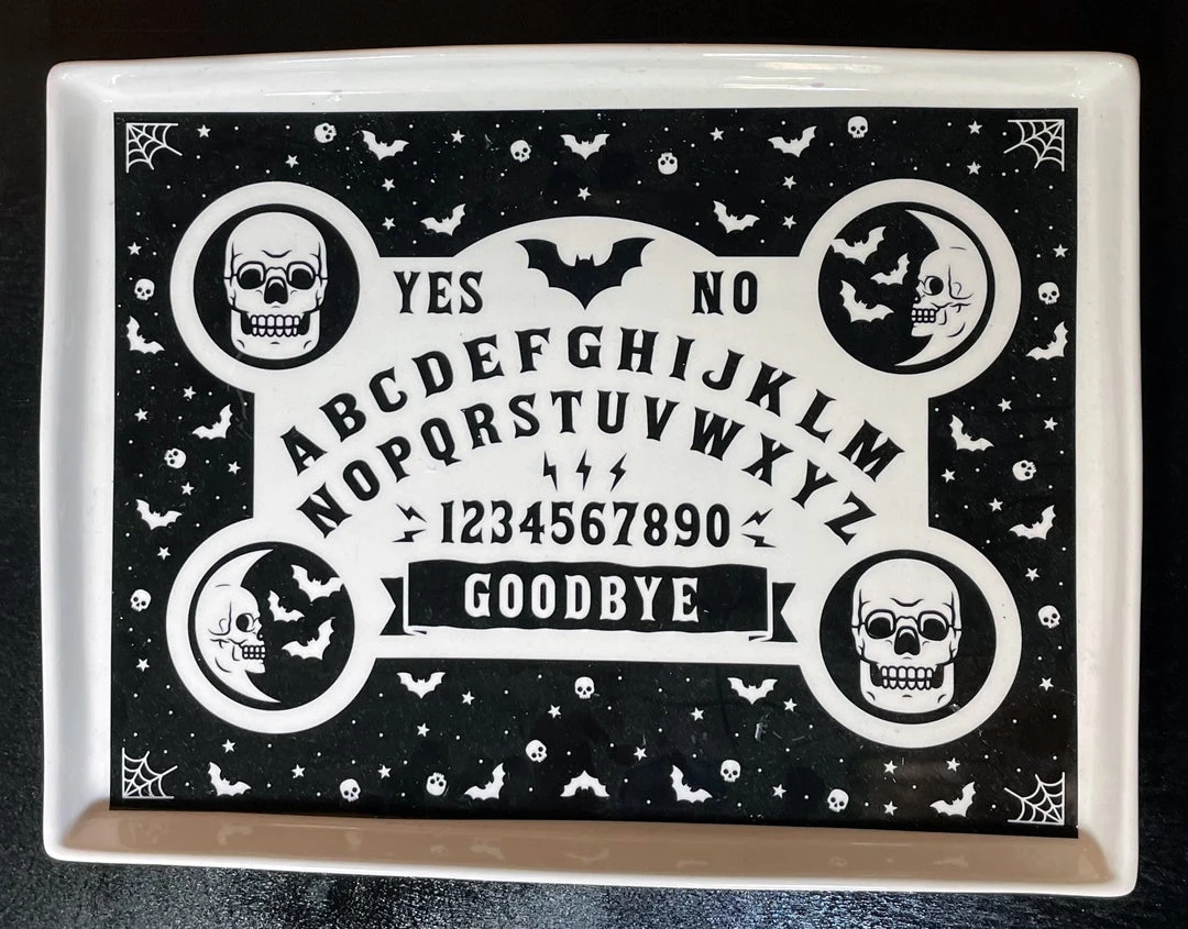 Entertain your favorite ghosts in style with our new Spirit Board Tray! This ceramic tray features classic spirit board imagery with a Sourpuss twist, with our bespoke bats and skull art. I’m seeing a charcuterie night in your future! Pairs perfectly with our Planchette Dish (sold separately) for a killer chip n’ dip combo!