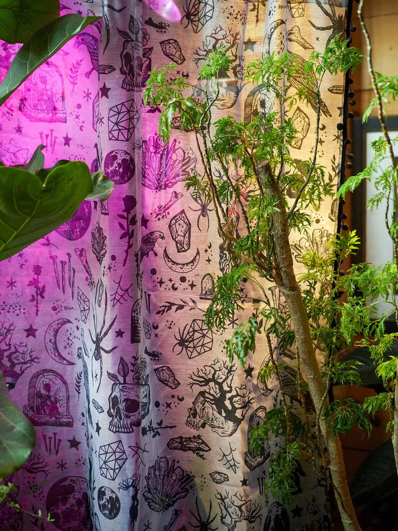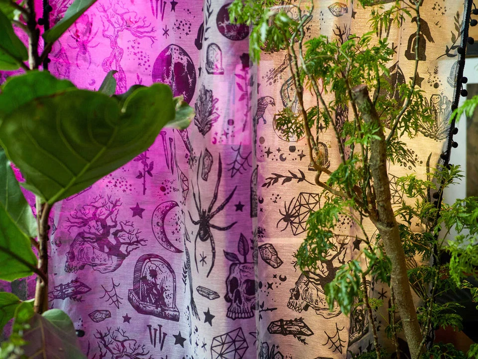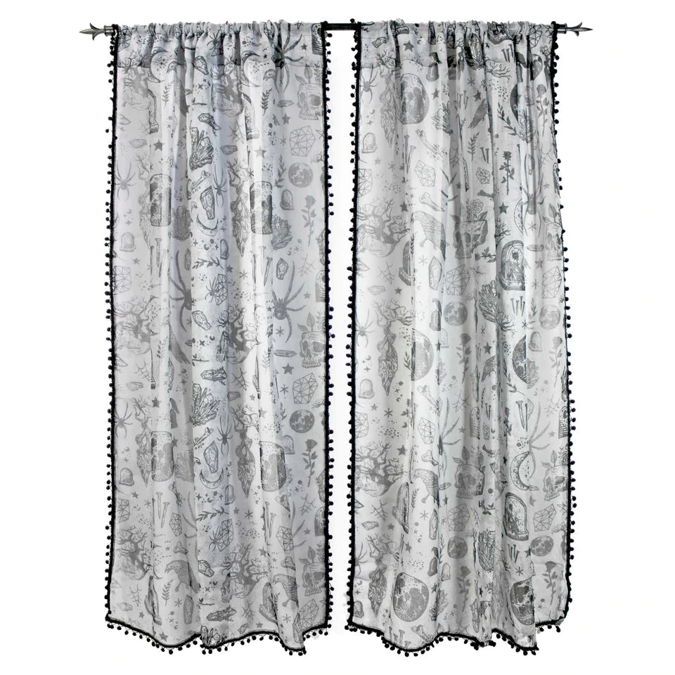 Stir up some home decor magic with new curtains! With an all over print of mystical objects, magical creatures and more in black on gray, our Night Walker Curtains add the perfect touch to your spooky abode. Semi-sheer, they have a tunnel at the top for your curtain rod and are finished with black pom pom trim.