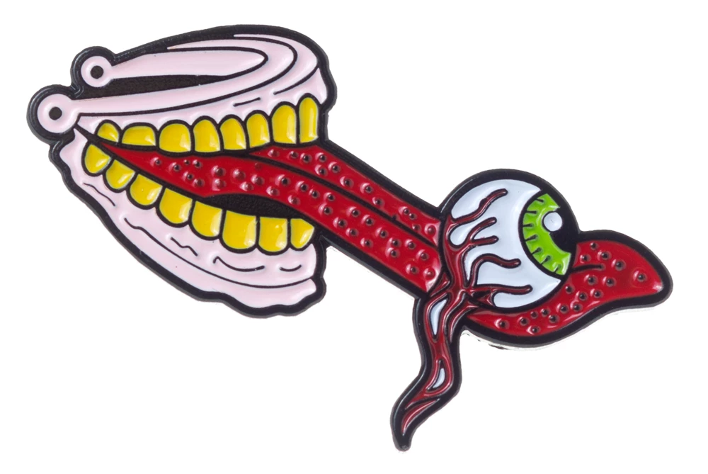 Chomp! Chomp! Chomp! This enamel pin is a spooky twist on a classic dime store novelty, the ol’ wind up dentures. Now open up and say ahhhhh!