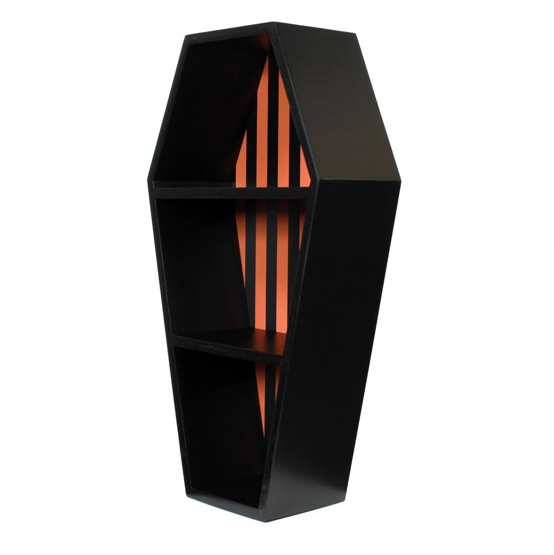 Surprise! We have the ultimate Halloween coffin shelf for you. Pumpkin and Black stripes are the tastiest background to display your autumn collectibles.