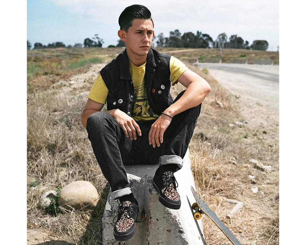 Normal is boring! Get ready to hit the stage or the streets in these vulcanized sneakers that re-imagines our former creeper sneaker silhouette with bold & modern twists. Features a vegan black twill upper & leopard faux fur with classic D-rings & iconic interlace detailing along the front. The fun animal print gives an extra dose of rock n’ roll that looks great on guys & girls alike!