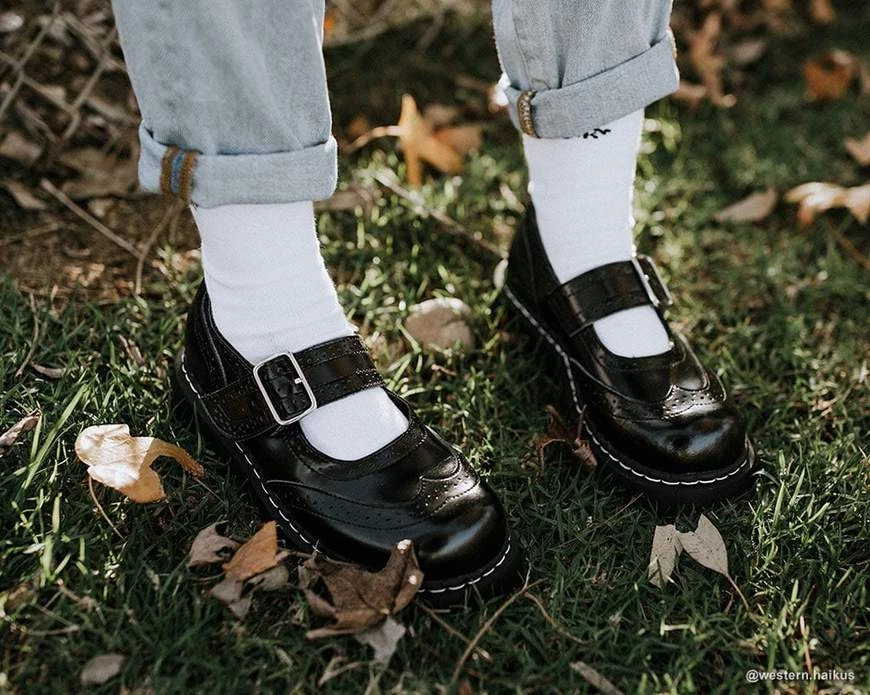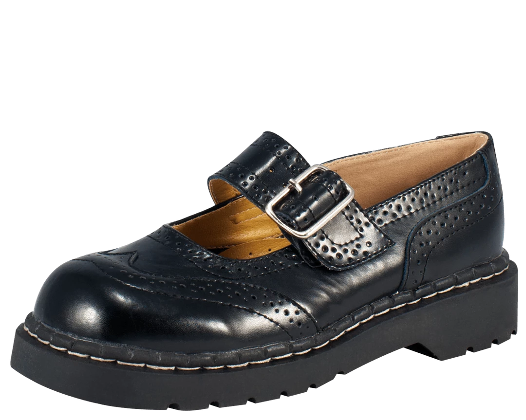 The Original Anarchic by T.U.K. Brogue Mary Jane. Black Leather, with Brogue Punched Details, a Silver Metal Buckle, and a 1 1/2 inch Heel.