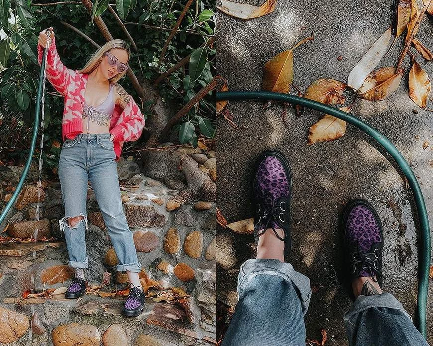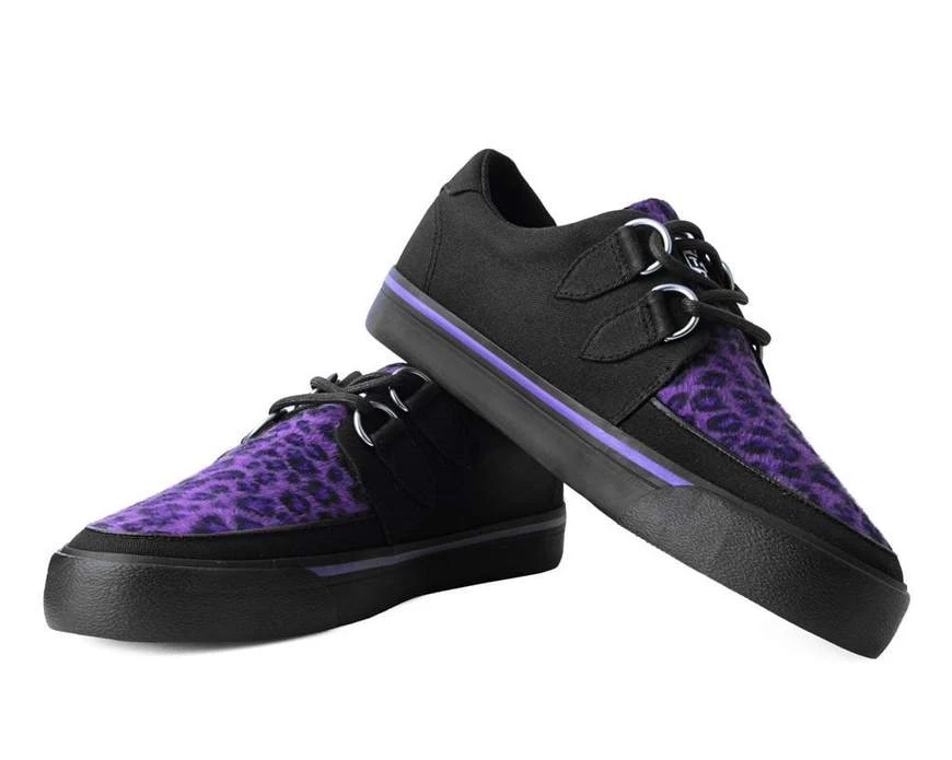 Rock your style in these timeless creeper sneakers. Get ready to hit the stage or the streets in these vulcanized sneakers that re-imagines our former creeper sneaker silhouette with bold & modern twists. Features a vegan black twill upper & purple leopard faux fur with classic D-rings iconic interlace detailing along the front. The fun animal print gives an extra dose of rock n’ roll that looks great on guys & girls alike!
