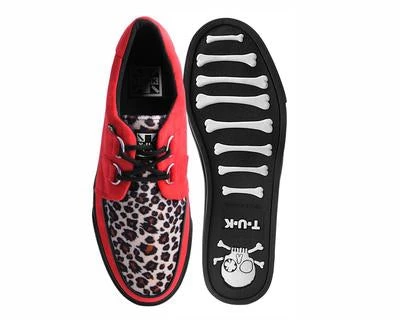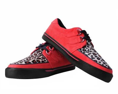 Normal is boring! Get ready to hit the stage or the streets in these vulcanized sneakers that re-imagines our former creeper sneaker silhouette with bold & modern twists. Features a vegan red twill upper & leopard faux fur with classic D-rings & iconic interlace detailing along the front. The fun animal print gives an extra dose of rock n’ roll that looks great on guys & girls alike!