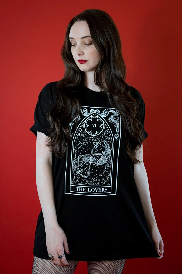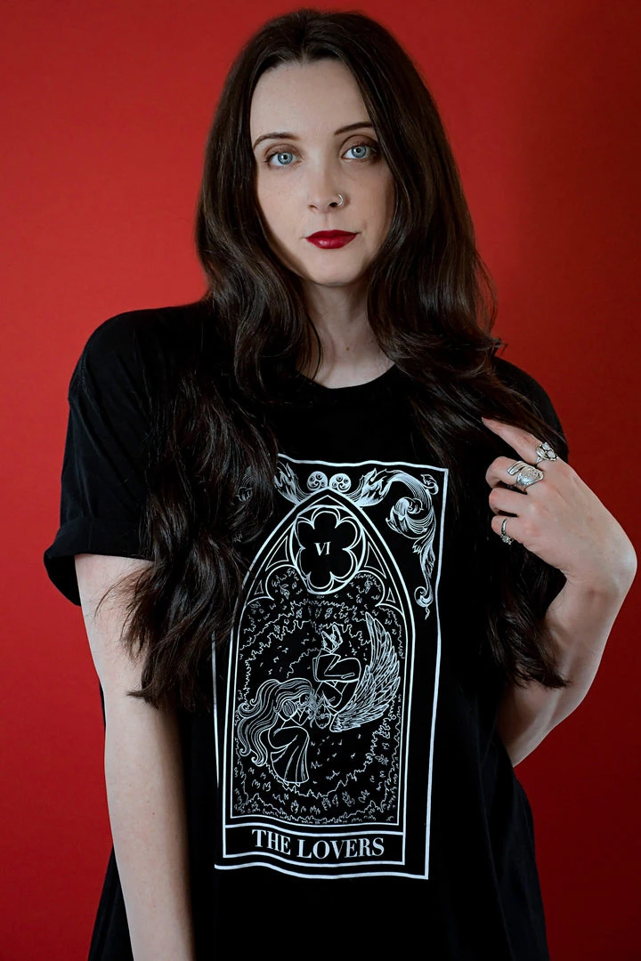This printed tee comes on our signature super soft tee, and it features our exclusive Lovers tarot card on front. The crew neckline and 100% cotton construction make this tee comfortable for all-day wear, and the short-sleeve cut means it’s perfect for layering. Wear this tee with your favorite denim or leggings and you are set.